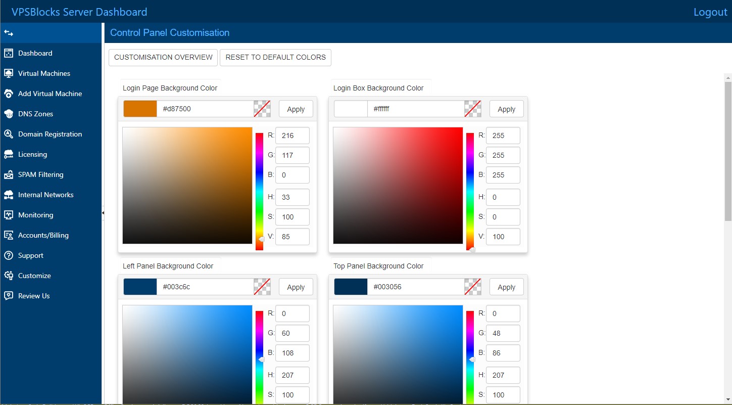 If you are reselling you can customise the look of the control panel including images and page colors, so your client sees your branding in the control panel.