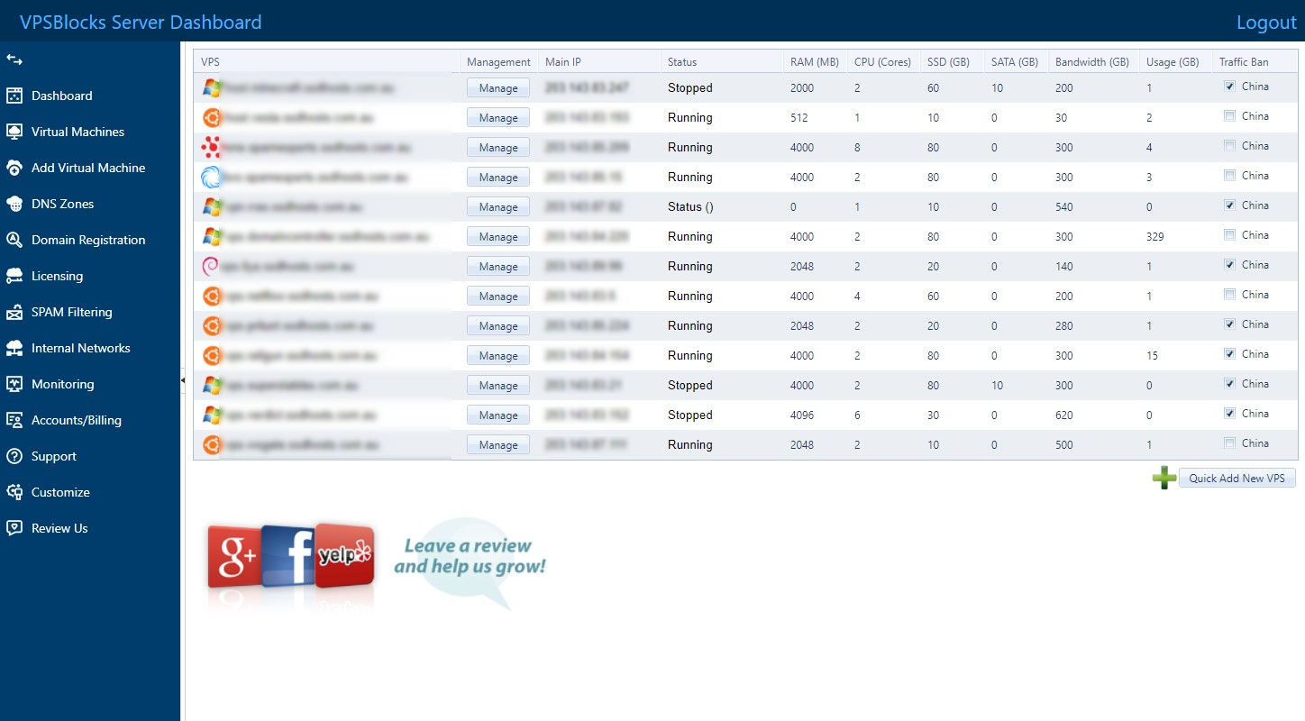 View all your VPSs and their allocated resources, block or unblock traffic from China (to reduce hacking attempts).